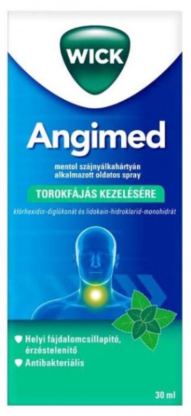 Betegtájékoztató: Információk a felhasználó számára Angimed mentol szájnyálkahártyán alkalmazott oldatos spray klórhexidin-diglükonát és lidokain-hidroklorid-monohidrát Mielőtt elkezdi alkalmazni ezt a gyógyszert, olvassa el figyelmesen az alábbi betegtájékoztatót, mert az Ön számára fontos információkat tartalmaz. Ezt a gyógyszert mindig pontosan a betegtájékoztatóban leírtaknak, vagy az Ön kezelőorvosa vagy gyógyszerésze által elmondottaknak megfelelően alkalmazza. - Tartsa meg a betegtájékoztatót, mert a benne szereplő információkra a későbbiekben is szüksége lehet. - További információkért vagy tanácsért forduljon gyógyszerészéhez. - Ha Önnél bármilyen mellékhatás jelentkezik, tájékoztassa kezelőorvosát vagy gyógyszerészét. Ez a betegtájékoztatóban fel nem sorolt bármely lehetséges mellékhatásra is vonatkozik. Lásd 4. pont. - Feltétlenül tájékoztassa kezelőorvosát, ha tünetei 3 4 napon belül nem enyhülnek, vagy éppen súlyosbodnak. A betegtájékoztató tartalma: 1. Milyen típusú gyógyszer az Angimed mentol szájnyálkahártyán alkalmazott oldatos spray és milyen betegségek esetén alkalmazható? 2. Tudnivalók az Angimed mentol szájnyálkahártyán alkalmazott oldatos spray alkalmazása előtt 3. Hogyan kell alkalmazni az Angimed mentol szájnyálkahártyán alkalmazott oldatos sprayt? 4. Lehetséges mellékhatások 5. Hogyan kell az Angimed mentol szájnyálkahártyán alkalmazott oldatos sprayt tárolni? 6. A csomagolás tartalma és egyéb információk 1. Milyen típusú gyógyszer az Angimed mentol szájnyálkahártyán alkalmazott oldatos spray és milyen betegségek esetén alkalmazható? Az Angimed mentol szájnyálkahártyán alkalmazott oldatos spray klórhexidin-diglükonátot tartalmaz, amely fertőtlenítő hatású, valamint lidokain-hidroklorid-monohidrátot, amely a helyi érzéstelenítők csoportjába tartozik, és érzéstelenítő hatása csökkenti a fájdalmat. Az Angimed mentol szájnyálkahártyán alkalmazott oldatos spray alkalmas a garat és a szájüreg rövid ideig tartó helyi, tüneti kezelésére, felnőttek és 6 évesnél idősebb gyermekek számára a következő betegségek esetén: - Torokfájás, torokgyulladás, irritációval kísért garat- és szájüregi betegségek, pl. fogínygyulladás, szájnyálkahártya-gyulladás és afta tüneteinek kezelése. 2. Tudnivalók az Angimed mentol szájnyálkahártyán alkalmazott oldatos spray alkalmazása előtt Ne alkalmazza az Angimed mentol szájnyálkahártyán alkalmazott oldatos sprayt: - ha allergiás a hatóanyagokra vagy a gyógyszer (6. pontban felsorolt) egyéb összetevőjére. - 6 évesnél fiatalabb gyermekeknél. - ha Ön alkoholfüggőségben szenved. Figyelmeztetések és óvintézkedések Az Angimed mentol szájnyálkahártyán alkalmazott oldatos spray alkalmazása előtt beszéljen kezelőorvosával vagy gyógyszerészével. - Az Angimed mentol szájnyálkahártyán alkalmazott oldatos sprayt nem szabad hosszú ideig, folyamatosan, illetve ismételten alkalmazni. Kizárólag csak a meglévő fájdalom és irritáció enyhítésére alkalmazza! - Túlzottan magas adagban alkalmazva előfordulhat a nyelési reflex csökkenése, és az étel a légutakba kerülve fulladást okozhat. - Mivel a gyógyszer levomentolt tartalmaz, fiatal gyermekek esetében elővigyázatosan alkalmazandó, ha korábban előfordultak a gyermeknél görcsrohamok (izomgörcs, lázgörcs). - Ha egyéb gyógyszereket is szed, kérjük, olvassa el az „Egyéb gyógyszerek és az Angimed mentol szájnyálkahártyán alkalmazott oldatos spray” című bekezdést. - Orvoshoz kell fordulni, ha a fertőzésnek a torokfájáson kívül egyéb tünetei (pl. láz, fejfájás, émelygés, hányás) is vannak. Ha a fenti figyelmeztetések valamelyike vonatkozik vagy vonatkozott Önre a múltban, keresse fel kezelőorvosát. Vigyázzon, hogy az oldat ne kerüljön a szemébe. Ha ez mégis megtörténik, legalább 15 percen keresztül mossa ki az érintett szemet tiszta vízzel vagy szemkimosó folyadékkal, közben tartsa nyitva a szemét. Gyermekek és serdülők 6 évesnél fiatalabb gyermekek esetében ne alkalmazza ezt a gyógyszert! Egyéb gyógyszerek és az Angimed mentol szájnyálkahártyán alkalmazott oldatos spray Feltétlenül tájékoztassa kezelőorvosát vagy gyógyszerészét a jelenleg vagy nemrégiben alkalmazott, valamint alkalmazni tervezett egyéb gyógyszereiről. - Más fertőtlenítő hatású szerrel együtt ne alkalmazza! Az Angimed mentol szájnyálkahártyán alkalmazott oldatos spray egyidejű alkalmazása étellel és itallal A készítményt közvetlenül evés, ivás után alkalmazza. Terhesség és szoptatás Ha Ön terhes vagy szoptat, illetve ha fennáll Önnél a terhesség lehetősége vagy gyermeket szeretne, a gyógyszer alkalmazása előtt beszéljen kezelőorvosával vagy gyógyszerészével. A fent említett óvintézkedések betartása mellett az Angimed mentol szájnyálkahártyán alkalmazott oldatos spray a terhesség és szoptatás ideje alatt is alkalmazható. Tájékoztassa kezelőorvosát arról, hogy ezt a készítményt alkalmazza. A készítmény hatásai a gépjárművezetéshez és a gépek kezeléséhez szükséges képességekre Nincs szükség különösebb elővigyázatosságra. Az Angimed mentol szájnyálkahártyán alkalmazott oldatos spray etanolt tartalmaz. Ez a gyógyszer kis mennyiségű – adagonként kevesebb, mint 100 mg – etanolt (alkoholt) tartalmaz. A szórófej ötszöri lenyomásával biztosított maximális adag, 142,8 mg tiszta alkoholt tartalmaz, ami káros az alkoholbetegségben szenvedők számára. Ezt a mennyiséget figyelembe kell venni terhes vagy szoptató nőknél, gyermekeknél és az olyan, magas kockázatú csoportoknál, mint a májbetegek vagy epilepsziás betegek. A készítményben található alkohol várhatóan nem lesz hatással f