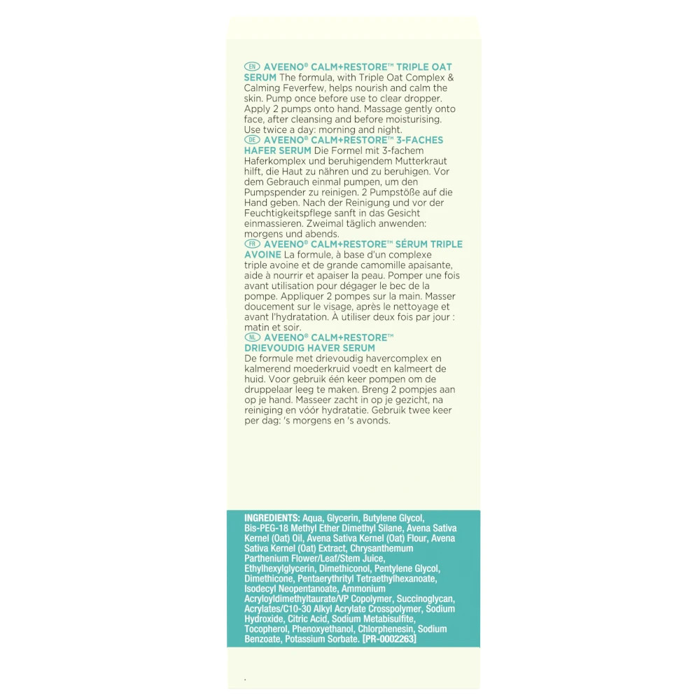 Aqua, Glycerin, Butylene Glycol, Bis-PEG-18 Methyl Ether Dimethyl Silane, Avena Sativa Kernel (Oat) Oil, Avena Sativa Kernel (Oat) Flour, Avena Sativa Kernel (Oat) Extract, Chrysanthemum Parthenium Flower/Leaf/Stem Juice, Ethylhexylglycerin, Dimethiconol, Pentylene Glycol,Dimethicone, Pentaerythrityl Tetraethylhexanoate, Isodecyl Neopentanoate, Ammonium Acryloyldimethyltaurate/VP Copolymer, Succinoglycan, Acrylates/C10-30 Alkyl AcrylateCrosspolymer, Sodium Hydroxide, Citric Acid, Sodium Metabisulfite, Tocopherol, Phenoxyethanol, Chlorphenesin, Sodium Benzoate, Potassium Sorbate