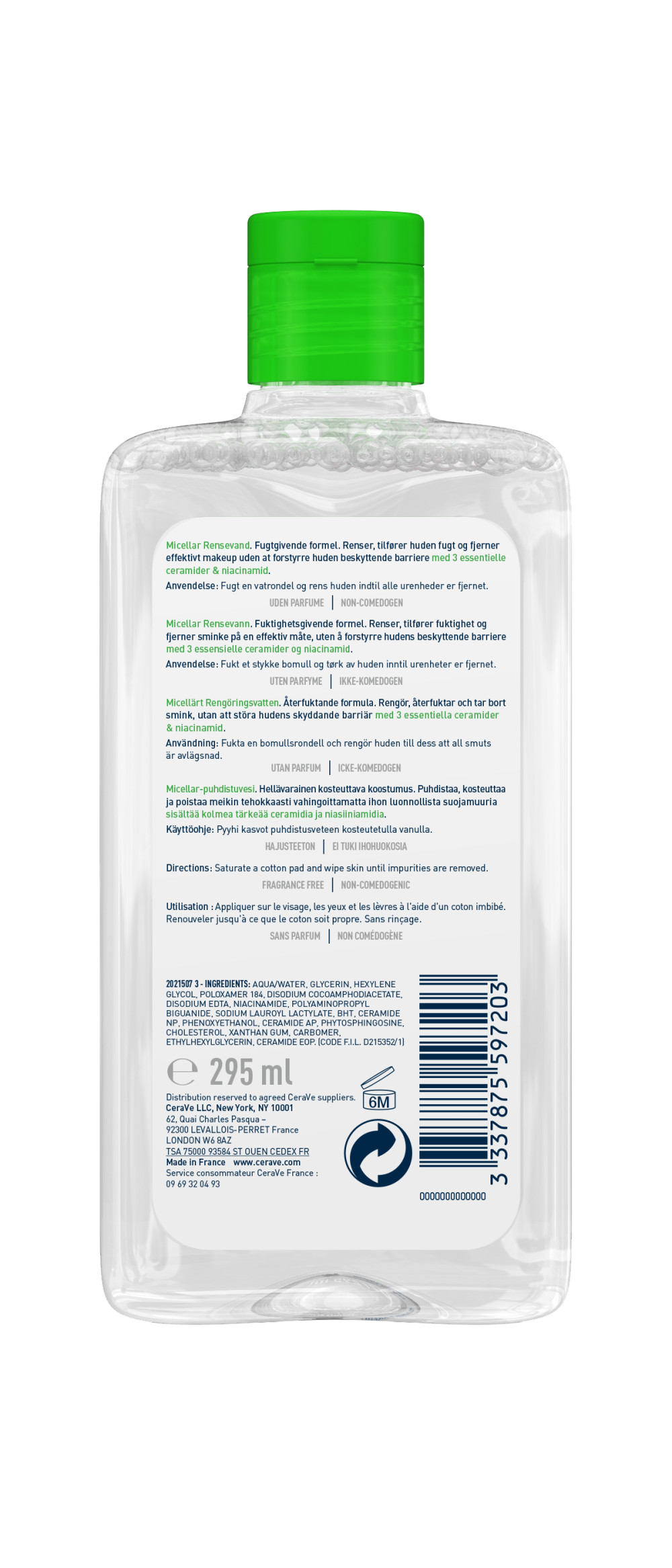 CeraVe Micellás arctisztító. Tisztít, hidratál, eltávolítja a sminket és támogatja a bőr védőrétegét.A bőrgyógyászokkal kifejlesztett CeraVe micellás arctisztító egy 3 az 1-ben termék, amely hatékonyan tisztít, hidratál és eltávolítja a sminket a bőr védőrétegének megzavarása nélkül. Ez az új, szemorvosi felügyelet mellett tesztelt formula a szempillaspirál vagy szemfesték érzékeny szemekről történő eltávolítására is megfelelő. Három alapvető ceramiddal és bőrnyugtató niacinamide-dal egy könnyen használható, nem leöblítendő formulában. Ez a kíméletes micellás arctisztító nem komedogén, illat- és parabénmentes.•A 3 az 1-ben formula tisztít, hidratál és eltávolítja a sminket a bőr védőrétegének megzavarása nélkül. •Eltávolítja a sminket az arcról és a szemekről. •Szemorvosi felügyelet mellett tesztelt, érzékeny szemekre is megfelelő. •Ceramidok: támogatják a bőr természetes védőrétegét. •Niacinamide: segít nyugtatni a bőrt. •Nem komedogén, illat- és parabénmentes. •Bőrgyógyászokkal kifejlesztve.Összetevők: 2021507 3 - INGREDIENTS: AQUA / WATER • GLYCERIN • HEXYLENE GLYCOL • POLOXAMER 184 • DISODIUM COCOAMPHODIACETATE • DISODIUM EDTA • NIACINAMIDE • POLYAMINOPROPYL BIGUANIDE • SODIUM LAUROYL LACTYLATE • BHT • CERAMIDE NP • PHENOXYETHANOL • CERAMIDE AP • PHYTOSPHINGOSINE • CHOLESTEROL • XANTHAN GUM • CARBOMER • ETHYLHEXYLGLYCERIN • CERAMIDE EOP (F.I.L. D215352/1).Kérjük, nézze meg a legújabb összetevők listáját