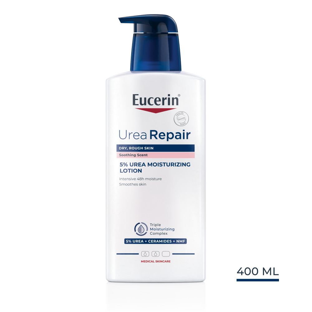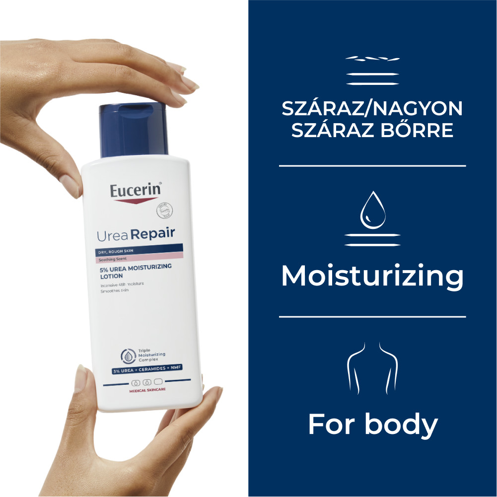 Az Eucerin® UreaRepair PLUS 5% Urea illatos testápoló egyedülálló urea hatóanyag kombinációt tartalmaz, amely hatékonyan veszi fel a harcot a bőrszárazságot kiváltó fő okok ellen.