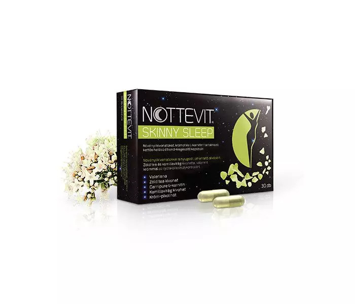 Pihentető alvás + zsírégetés természetes testsúlycsökkentő összetevőkkel az éjszakai testsúlykontrollért Új, gyógynövény alapú esti stresszoldó, alvást segítő készítmény az éjszakai testsúlykontroll szolgálatában. Vegye kézbe a testsúlya feletti kontrollt minőségi alvással és célzott, minőségi összetevőkkel! Mire fejlesztették ki a NOTTEVIT Skinny Sleep ® kapszulát? A stressz és a jó minőségű alvás hiánya számtalan egészségügyi kockázatot hordoz magában. A szervezet nem tud éjszaka megfelelően regenerálódni és ez bőrünk mellett a testsúlyunkra is negatív hatással lehet. Ennek oka, hogy a kevés vagy rossz minőségű alvás növeli az ételek iránti sóvárgást, hiszen két, az étvágyat szabályozó hormon szintjének rendellenes változását vonja maga után. Az egyik a leptin, amely a zsíranyagcsere, illetve az étvágy és jóllakottság hosszú távú szabályozásában játszik fontos szerepet. A másik hormon a ghrelin vagyis az “éhséghormon”, amely az éhségérzet kiváltásáért felelős. A rossz minőségű alvás okozta kialvatlanság a leptin szintjének csökkenéséhez, valamint a ghrelin értékének növekedéséhez vezet. Ez állandó éhségérzetet okoz és egyre több étkezésre serkent. Ráadásul a ghrelin hormon szintje akár már egy rossz minőségű, kevés alvással töltött éjszaka után is a normálistól eltérően megemelkedhet. Emiatt bizonyítottan* nagyobb adag ételeket veszünk magunkhoz és magasabb szénhidrát/kalória tartalmú élelmiszerek felé fordulunk. A keveset vagy rosszul alvóknak az anyagcseréje is lassul, emiatt kevesebb kalóriát használnak el napközben, ami szintén elhízáshoz vezethet. A megfelelő mennyiségű és minőségű alvás tehát – a megfelelő tápanyagokkal kiegészítve - a hosszú távú és eredményes testsúlykontroll fontos eleme. Ehhez nyújt segítséget az egyedülálló, kettős hatású NOTTEVIT Skinny Sleep ® kapszula Miért egyedülálló a kettős hatású NOTTEVIT? Mert a NOTTEVIT Skinny Sleep® az egyetlen, kettős hatású esti stresszoldó, alvást segítő termék az éjszakai testsúlykontroll szolgálatában: egy hagyományos készítményhez képest nem csak a minőségi alvásban segít, hanem értékes összetevőivel hozzájárul az alvás közbeni fokozott zsírégetéshez és a testsúly csökkentéséhez. A minőségi alvást standardizált valeriana, golgotavirág és komlótoboz kivonatokkal támogatja. Éjszakai testsúlykontrollt támogató összetevői pedig minden éjjel belülről segítik a zsírlebontó anyagcserét: az epigallokatechinben (EGCG) gazdag, koffeinmentes japán zöld tea kivonat hozzájárul a fokozott zsírégetéshez és a testzsír csökkentéséhez, a kamillavirág kivonat pedig hozzájárul a testsúly csökkentéséhez, valamint a megfelelő zsíranyagcseréhez és emésztéshez. A benne található króm részt vesz a makrotápanyagok normál anyagcseréjében és hozzájárul a normál vércukorszint fenntartásához, emellett magas tisztaságú svájci Carnipure® L-karnitin is található ebben a kettős hatású készítményben. Miért ajánljuk? Mert a NOTTEVIT Skinny Sleep® többet nyújt, mint egy hagyományos alvást segítő készítmény: nemcsak segít a nyugodt, pihentető alvásban, de az éjszakai testsúlykontrollt támogató összetevőket is tartalmaz. A NOTTEVIT Skinny Sleep®-nek nincs helyettesítő terméke a patikákban vagy azon kívül! Kiknek ajánljuk? Elsősorban azoknak, akikkel előfordul, hogy esténként a stressz miatt nem tudnak elaludni, nem alszanak eleget vagy éjjelente felébrednek és a kialvatlanság mellett a mindennapi testsúlykontrollhoz is szeretnének segítséget kapni. Ők a pihentetőbb alvás mellett hosszabb távon szervezetük éjszakai zsíranyagcseréjét, illetve az egészséges testsúly szabályzását is célzott hatóanyagokkal szeretnék segíteni. Ajánlott fogyasztása: lefekvés előtt 1-2 kapszulát kevés folyadékkal bevenni. Van-e bármilyen mellékhatása, okoz e hozzászokást? A termék gyógynövényeket tartalmaz, így hozzászokást nem okoz! Altató hatása a vényköteles gyógyszerekkel összevetve egyénenként változó lehet. Az esti stresszoldást, pihentető alvást leggyakrabban már az első estén érezhetünk, azonban a teljes hatáserősség felépüléséhez néhány hét szükséges. A macskagyökeret a WHO enyhe, lelki eredetű nyugtalanság, feszültség oldására és szintén enyhe fokú elalvási zavarokra ajánlja. Hatásosságáról pozitív, megerősítő ESCOP- és WHO-monográfia is készült. A macskagyökérrel kapcsolatban szintén fontos tudni, hogy a szintetikus nyugtató-, altatószerekkel ellentétben a hatása fokozatosan épül fel, szervezettől függően 2-4 hetes folyamatos szedés után éri el maximális hatáserősségét, így kúraszerű szedése javasolt. Mellékhatása nem ismert. Minden valeriana (macskagyökér) kivonatot tartalmazó készítmény ellenjavallt terhesség, illetve szoptatás idején. Hatóanyagok 1 kapszulában: Standardizált gyógynövénykivonatok: Macskagyökér kivonat 120 mg Golgotavirág kivonat 40 mg Komló toboz kivonat 40 mg Éjszakai testsúlykontroll összetevők: SUNPHENON® zöld tea kivonat 130 mg CARNIPURE® L-karnitin 150 mg Kamillavirág kivonat 150 mg Króm pikolinát 0,45 mg Összetevők: L-karnitin-L-tartarát, kamillavirág kivonat, zöld tea kivonat, kapszulatok (hidroxi-propil-metilcellulóz, színezék: klorofil-rézkomplex), macskagyökér kivonat, komló toboz kivonat, golgotavirág kivonat, króm-pikolinát, csomósodást gátló anyag (magnézium-sztearát). Növényi kivonatokat és vitaminokat tartalmazó étrend-kiegészítő kapszula. Az étrend-kiegészítő fogyasztása nem helyettesíti a kiegyensúlyozott vegyes étrendet és az egészséges életmódot. * Measures of Poor Sleep Quality Are Associated W