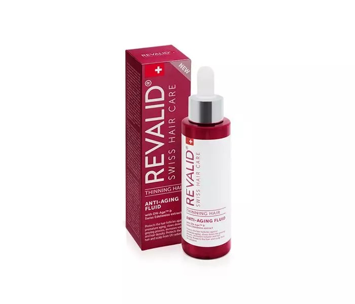 A Revalid Anti-Aging Fluid színvédelemmel, innovatív DN-Age™ összetevőt (amely a Cassia Alata levél kivonata), valamint a svájci Alpokból származó havasi gyopár kivonatot tartalmaz. Az összetevők antioxidáns és DNS-védő tulajdonságainak köszönhetően, a fluid védelmet nyújt a fejbőrnek az idő előtti öregedéssel szemben, csökkentve az oxidatív stresszt a hajhagymákban. Lelassítja az őszülés folyamatát, növeli a haj mennyiségét és sűrűségét, valamint védi a hajat és a fejbőrt a káros UV-sugárzástól és a környezet szennyeződéseitől. Parabén-; szulfát-; szilikon- és alkoholmentes.