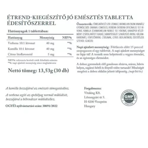 A Vitaking Jó emésztés komplex kapszulánként 40 mg verbéna kivonatot, 40 mg kamilla kivonatot, 5 mg citrus bioflavonoidot és bromelaint is tartalmaz.