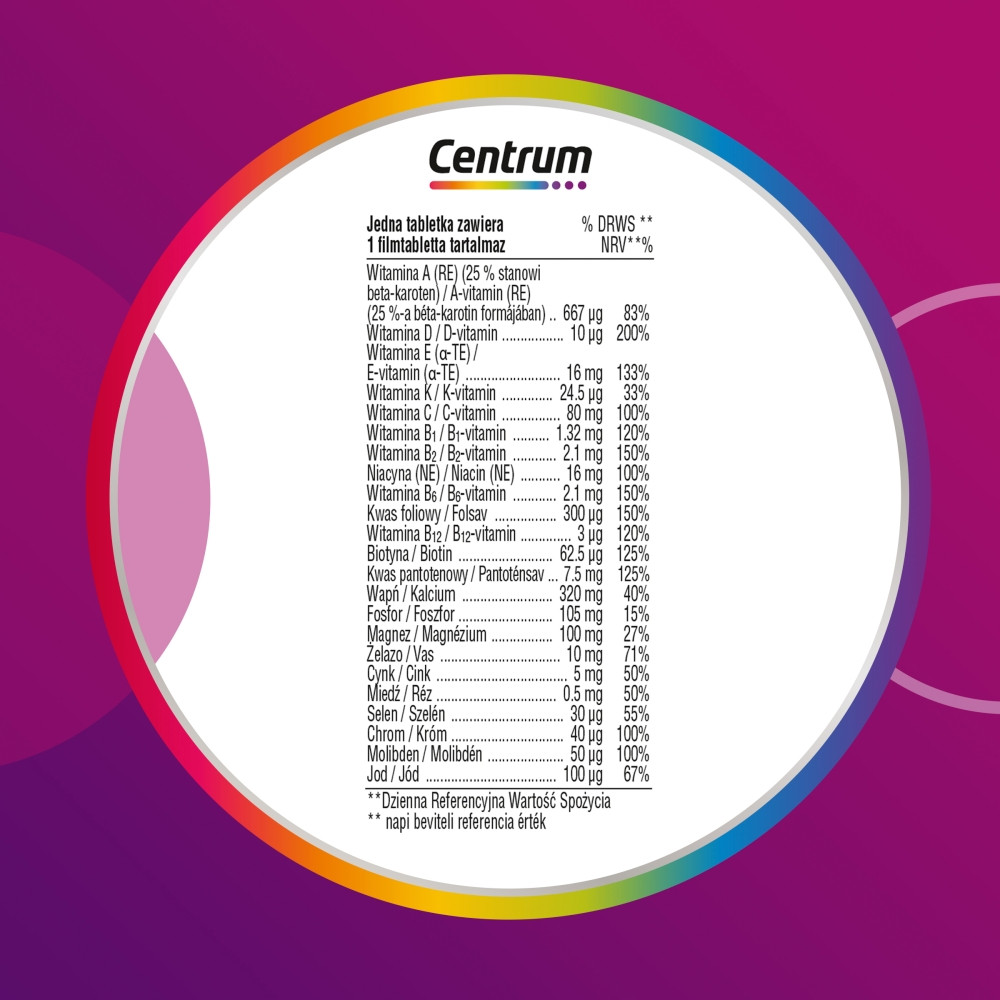 A Centrum® Nőknek különlegesen kiegyensúlyozott összetételével hozzájárul a nők tápanyagszükségletének fedezéséhez, és számos területen támogatja szervezetük működését.