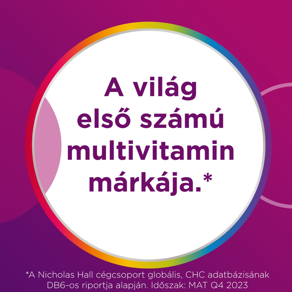 dikalcium-foszfát, magnézium-oxid, kalcium-karbonát, tömegnövelő szerek (E460, E468, E464, E1200), L-aszkorbinsav, módosított keményítő, nikotinamid, DL-alfa-tokoferil-acetát, maltodextrin, ferro-fumarát, kalcium-D-pantotenát, cink-oxid, mangán-szulfát, emulgeálószer (E470b), keményítő, csomósodást gátló anyagok (E551, E553b), zselatin, piridoxin-hidroklorid, riboflavin, tiamin-mononitrát, béta-karotin, pálmaolaj, kupri-szulfát, szacharóz, retinil-acetát, glükóz-szirup, pteroilmonoglutaminsav, króm-klorid, nátrium-molibdát, kálium-jodid, nátrium-szelenát, biotin, antioxidáns (E321), fitomenadion, kolekalciferol, cianokobalamin, színezékek (E171, E120, E133).