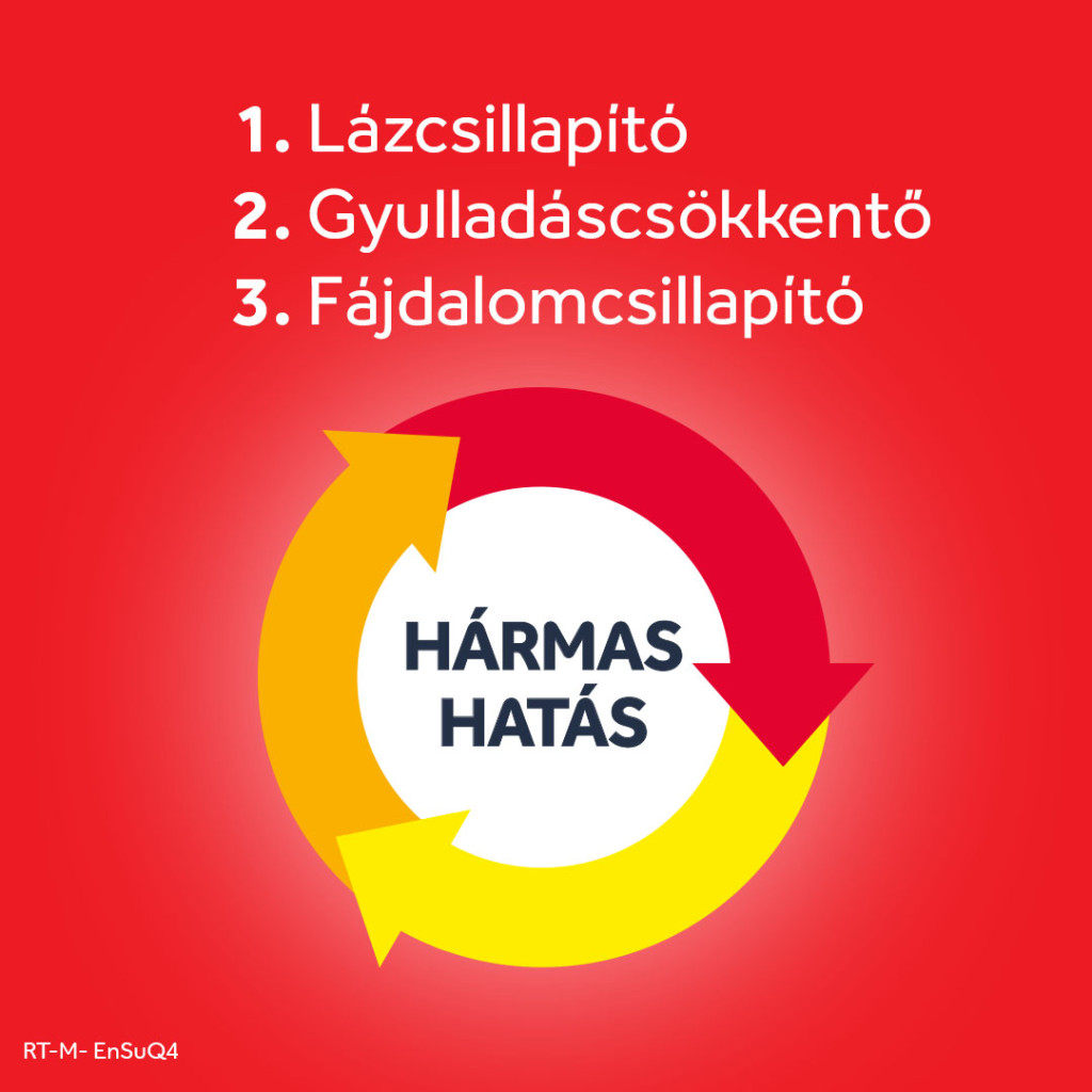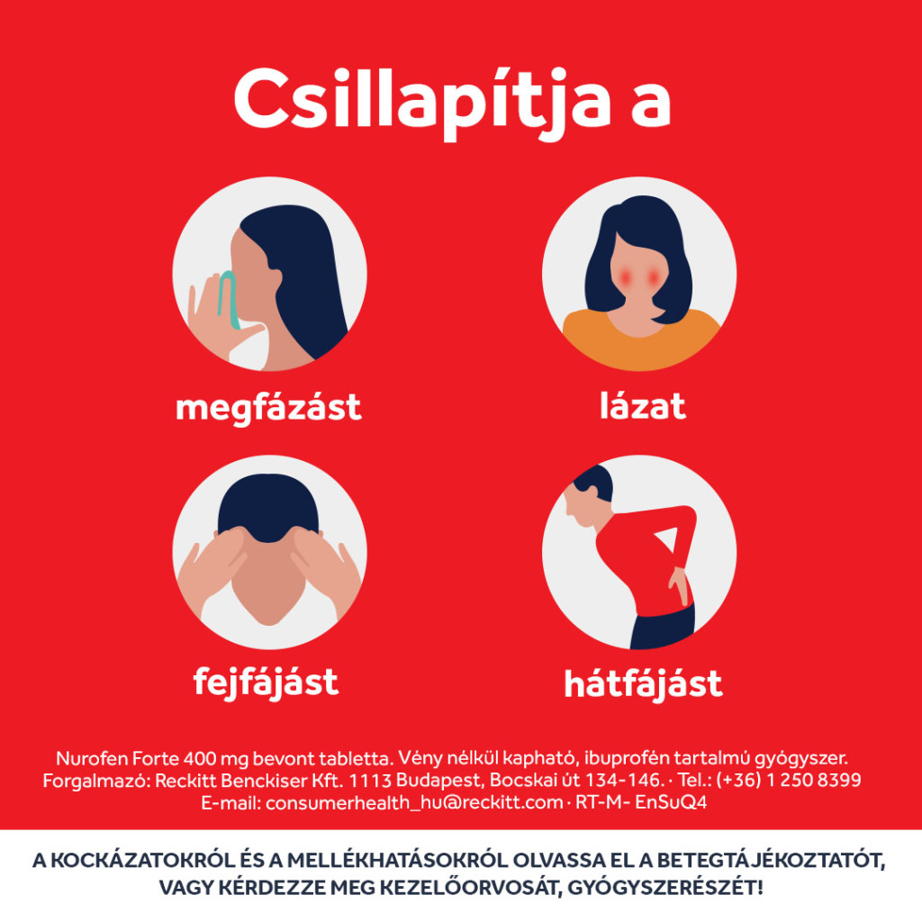 1. A GYÓGYSZER NEVE Nurofen Forte 400 mg bevont tabletta 2. MINŐSÉGI ÉS MENNYISÉGI ÖSSZETÉTEL 400 mg ibuprofént tartalmaz bevont tablettánként. Ismert hatású segédanyagok: 232,2 mg szacharózt és 34,69 mg nátriumot tartalmaz bevont tablettánként. A segédanyagok teljes listáját lásd a 6.1 pontban. 3. GYÓGYSZERFORMA Bevont tabletta. Fehér, illetve csaknem fehér színű, kerek, domború felületű, egyik oldalán piros színű „NUROFEN 400” jelzéssel ellátott cukor bevonatú tabletta. Törési felülete: fehér színű. 4. KLINIKAI JELLEMZŐK 4.1 Terápiás javallatok Különböző eredetű fejfájás (pl. migrén), menstruációs fájdalmak, hátfájás, izomfájdalom, fogfájás, neuralgiás fájdalmak, meghűléses és influenzás tünetek, valamint láz gyors és hatékony csillapítása. 4.2 Adagolás és alkalmazás Kizárólag szájon át történő rövid távú alkalmazásra. A legkisebb hatásos dózist kell alkalmazni a tünetek enyhítéséhez szükséges legrövidebb ideig (lásd 4.4 pont). Felnőttek és 12 évesnél idősebb gyermekek és serdülők: a kezdő dózis 1 bevont tabletta, a továbbiakban, amennyiben szükséges, 4 óránként 1 bevont tabletta bevehető. A maximális napi adag nem haladhatja meg a 3 bevont tablettát (1200 mg-ot). Máj- és vesekárosodás esetén az adagolást egyénre szabottan kell kialakítani. Idősek: nem szükséges az adagolás módosítása. Gastrointestinalis problémákkal küszködő betegeknek tanácsos a gyógyszert étkezés közben bevenni. Csak rövidtávú kezelésre használható. Amennyiben a Nurofen Forte 400 mg bevont tablettát 3 napnál tovább kell szedni, vagy ha a tünetek rosszabbodnak, orvossal kell konzultálni. 4.3 Ellenjavallatok A készítmény hatóanyagával vagy a 6.1 pontban felsorolt bármely segédanyagával szembeni túlérzékenység. A betegek anamnézisében szereplő túlérzékenységi reakciók (pl. bronchospasmus, asthma, rhinitis, angioedema vagy urticaria), melyek acetilszalicilsav (ASA), vagy más nem-szteroid gyulladásgátló készítmények (NSAID-ok) szedésével összefüggésében jelentkeztek. Aktív vagy a kórelőzményben szereplő visszatérő peptikus fekély/vérzés (bizonyított fekély vagy vérzés két vagy több megkülönböztethető epizódja). Korábbi NSAID kezelés kapcsán fellépő gastrointestinalis vérzés vagy perforatio a kórelőzményben. Súlyos máj-, vese- vagy szívbetegségben szenvedő betegek esetén (lásd még 4.4 pont). Súlyos szívelégtelenség (NYHA Class IV). 12 éves kor alatti gyermekek. Terhesség utolsó 3 hónapja (lásd még 4.6 pont). 4.4 Különleges figyelmeztetések és az alkalmazással kapcsolatos óvintézkedések A mellékhatások minimalizálhatók oly módon, hogy a legalacsonyabb hatásos dózist alkalmazzák a tünetek kezeléséhez szükséges legrövidebb ideig (lásd alább a gastrointestinális és cardiovascularis kockázatokat). Az időskorúak esetében megnövekedett az NSAID-ok alkalmazásával kapcsolatban kialakuló mellékhatások gyakorisága, különösen a gastrointestinalis vérzés és perforatio, amely végzetes is lehet (lásd 4.2 pont). Fennálló fertőzések tüneteinek elfedése: A Nurofen Forte 400 mg bevont tabletta elfedheti a fertőzés tüneteit, ami miatt késhet a megfelelő kezelés megkezdése és ezáltal súlyosabb lehet a fertőzés kimenetele. Ezt bakteriális, közösségben szerzett tüdőgyulladás és a bárányhimlő bakteriális szövődményei esetében észlelték. Ha a Nurofen Forte 400 mg bevont tablettát egy fertőzés kapcsán láz és fájdalom csillapítására alkalmazzák, ajánlatos a fertőzést figyelemmel kísérni. Nem kórházi környezetben a betegnek orvossal kell konzultálnia, ha a tünetek tartósan fennállnak vagy súlyosbodnak. Légzőszervi hatások: A bronchospasmus súlyosbodhat a kórelőzményben szereplő vagy jelenleg is fennálló allergiás megbetegedés vagy asthma esetén. Egyéb NSAID-ok: A Nurofen egyéb NSAID-okkal, ideértve a COX-2 gátlókat is, történő együttes alkalmazása fokozza a mellékhatások előfordulásának kockázatát, ezért a kombináció alkalmazását el kell kerülni. Szisztémás lupus erythematosus (SLE) és kevert kötőszöveti betegség (MCTD): Az asepticus meningitis kockázatának növekedése miatt, fennálló szisztémás lupus erythematosus (SLE) és más autoimmun betegségekben, csak az előny/kockázat gondos mérlegelése alapján rendelhető (lásd 4.8 pont). Gastrointestinalis hatások NSAID óvatosan adható azon betegeknek, akiknek az anamnézisében gastrointestinalis betegség szerepel (pl. colitis ulcerosa, Crohn-betegség), mivel állapotuk súlyosbodhat. Gastrointestinalis vérzést, fekélyt vagy perforációt - akár halálos kimenetellel is -, minden NSAID kezeléssel kapcsolatban jelentettek már, melyek a kezelés során figyelmeztető tünetekkel, illetve a nélkül bármikor bekövetkezhetnek, az anamnézisben előforduló korábbi súlyos gastrointestinalis esemény nélkül is. A gastrointestinalis vérzés, fekélyképződés és perforáció kockázata növekszik az NSAID adagjának emelésével azoknál a betegeknél, akiknek az anamnézisében fekély szerepel, főleg, ha vérzéses szövődménnyel vagy perforációval jelentkezett, valamint idős betegek esetén. Ezen betegeknél a kezelést a lehető legkisebb adaggal kell kezdeni. Megfontolandó gyomorvédő készítmény alkalmazása (pl. mizoprosztol vagy protonpumpa-gátló) ilyen esetben, illetve olyan betegeknél, akik egyidejűleg kisadagú acetilszalicilsav vagy más gastrointestinalis kockázatot fokozó gyógyszeres kezelésben részesülnek (lásd 4.5 pont). Azon betegeknek, akiknek a kórelőzményében gastrointestinalis (GI) toxicitás szerepel, különösen, ha idős betegekről van szó, minden szokatlan hasi tünetet (főleg GI vérzés esetén) jelentenie kell, főleg a kezelés kezdeti szaka