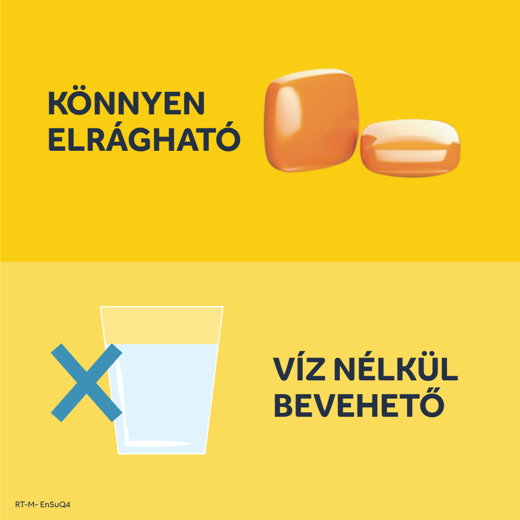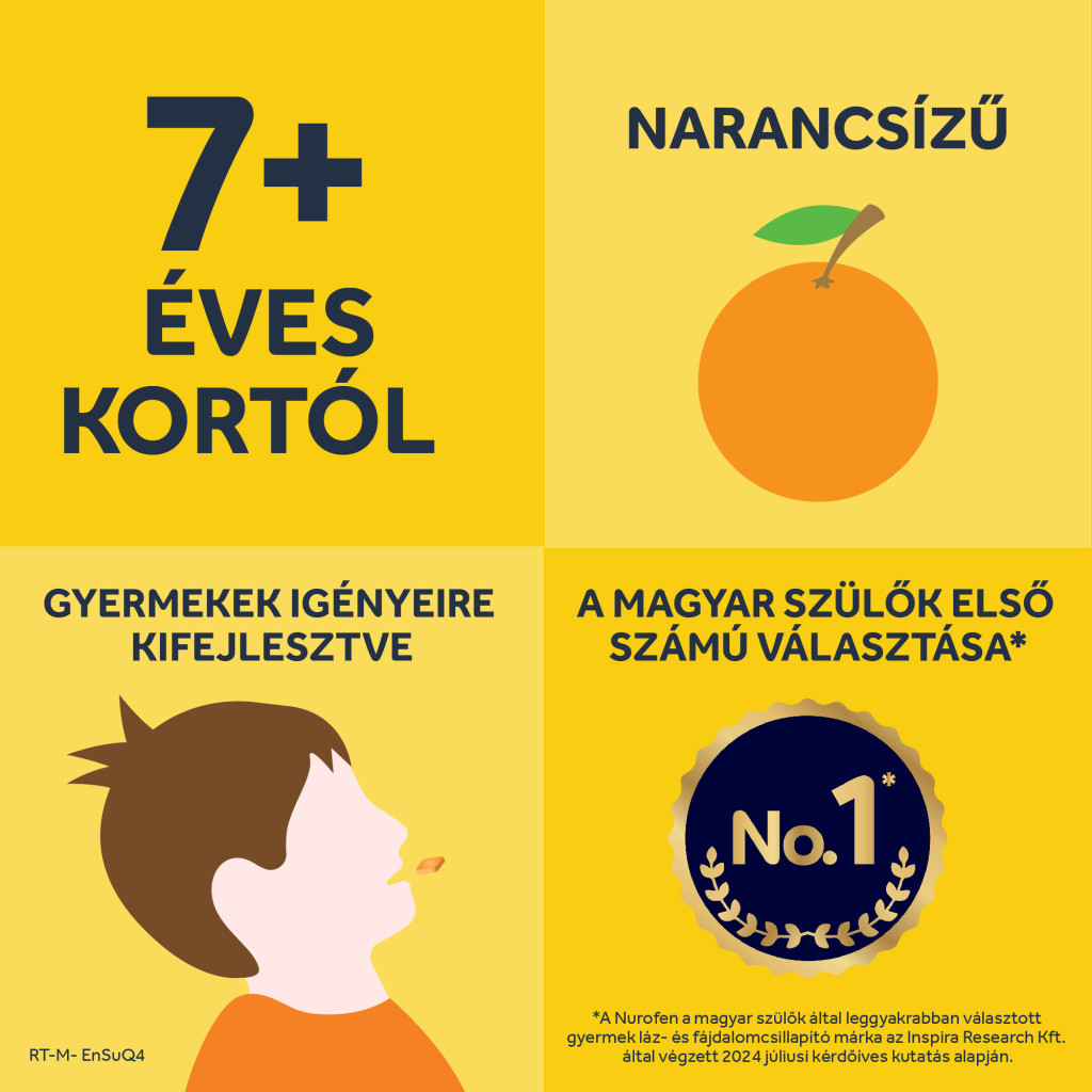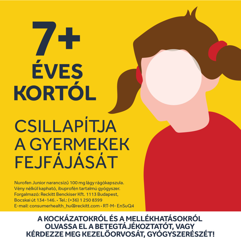 1. A GYÓGYSZER NEVE Nurofen Junior narancsízű 100 mg lágy rágókapszula 2. MINŐSÉGI ÉS MENNYISÉGI ÖSSZETÉTEL 100 mg ibuprofént tartalmaz lágy rágókapszulánként. Ismert hatású segédanyagok: 358,3 mg glükózt tartalmaz rágókapszulánként. 251,6 mg szacharózt tartalmaz rágókapszulánként. 0.01 mg szójalecitint tartalmaz rágókapszulánként. 0,027 mg nátriumot tartalmaz rágókapszulánként. A segédanyagok teljes listáját lásd a 6.1 pontban. 3. GYÓGYSZERFORMA Lágy rágókapszula. Narancsszínű, négyzet alakú, lágy zselatin rágókapszula, nyomtatott fehér színű „N100” jelzéssel ellátva, kb. 5 és 8 mm szélességű, átlója 15 és 17 mm hosszú. 4. KLINIKAI JELLEMZŐK 4.1 Terápiás javallatok A készítmény legalább 20 kg (7 éves) – 40 kg (12 éves) testsúlyú gyermekek esetében ajánlott, láz csökkentésére valamint megfázás és influenza tüneti kezelésére. Enyhe és közepesen erős fájdalom enyhítésére olyan esetekben, mint például torokfájás, fogfájás, fülfájás, fejfájás, kisebb fájdalmak és ficamok. 4.2 Adagolás és alkalmazás Adagolás Kizárólag szájon át történő rövid távú alkalmazásra. A legkisebb hatásos dózist kell alkalmazni a tünetek enyhítéséhez szükséges legrövidebb ideig (lásd 4.4 pont). A készítmény adagolása a gyermek testsúlyának függvényében adható meg, egyszeri adagja 5 10 mg/ttkg. A Nurofen lágy rágókapszula maximálisan bevehető napi adagja 20-30 mg/ttkg. Az ajánlott napi adag a következőképpen érhető el: Gyermek testsúlya (kg) Életkora (év) Egyszeri dózis Maximálisan bevehető napi 20-29 7-9 200 mg ibuprofén (2 rágókapszulának felel meg) 600 mg ibuprofén (6 rágókapszulának felel meg) 30-40 10-12 300 mg ibuprofén (3 rágókapszulának felel meg) 900 mg ibuprofén (9 rágókapszulának felel meg) Az adagokat körülbelül 6 8 óránként kell beadni szükség szerint (az egyes adagok bevétele között legalább 6 órának el kell telnie). Nem alkalmazható 7 évesnél fiatalabb vagy 20 kg testsúly alatti gyermekek esetében. Amennyiben ezt a gyógyszert 3 napnál tovább kell alkalmazni, vagy ha a tünetek rosszabbodnak, orvossal kell konzultálni. Különleges betegcsoportok Vesekárosodás Enyhe vagy közepesen súlyos vesekárosodás esetén nem szükséges a dózis csökkentése (súlyos veseelégtelenségben szenvedő betegek esetén lásd a 4.3 pontot). Májkárosodás Enyhe vagy közepesen súlyos májkárosodás esetén nem szükséges a dózis csökkentése (súlyos májműködési zavarban szenvedő betegek esetén lásd a 4.3 pontot). Az alkalmazás módja Szájon át történő alkalmazásra. A készítményt alaposan meg kell rágni lenyelés előtt. Víz nem szükséges a készítmény bevételéhez. 4.3 Ellenjavallatok • A készítmény hatóanyagával vagy a 6.1 pontban felsorolt bármely segédanyagával szembeni túlérzékenység. • Olyan betegek esetében, akiknél acetilszalicilsav vagy más nem-szteroid gyulladásgátló (NSAID-ok) alkalmazásával összefüggésben, a kórelőzményben túlérzékenységi reakció (pl. asthma, rhinitis, angioedema vagy urticaria) szerepel. • Jelenleg is fennálló vagy a kórelőzményében szereplő kiújuló peptikus fekély/vérzés (bizonyíthatóan két vagy több alkalommal jelentkező fekély vagy vérzés). • Korábbi NSAID-kezelés kapcsán fellépő gastrointestinalis vérzés vagy perforatio az anamnézisben. • Súlyos szívelégtelenségben (NYHA Class IV), súlyos veseelégtelenségben vagy súlyos májelégtelenségben szenvedő betegek esetén (lásd 4.4 pont). • A terhesség utolsó trimeszterében (lásd 4.6 pont). • A készítmény szójalecitint tartalmaz. Ne alkalmazza a készítményt, amennyiben földimogyoró vagy a szója allergiája van. • Cerebrovascularis- vagy egyéb aktív vérzés. • Tisztázatlan vérképzési zavarok esetén. • Súlyos dehidratáció (hányás, hasmenés vagy nem megfelelő folyadékbevitel következtében kialakuló) esetén. 4.4 Különleges figyelmeztetések és az alkalmazással kapcsolatos óvintézkedések A mellékhatások minimalizálhatók oly módon, hogy a legalacsonyabb hatásos dózist alkalmazzák a tünetek kezeléséhez szükséges legrövidebb ideig (lásd alább a gastrointestinalis és cardiovascularis kockázatokat). Az idősek esetében megnövekedett az NSAID-ok alkalmazásával kapcsolatban kialakuló mellékhatások gyakorisága, különösen a gastrointestinalis vérzés és perforatio, amely végzetes is lehet. Fennálló fertőzések tüneteinek elfedése A Nurofen Junior narancsízű 100 mg lágy rágókapszula elfedheti a fertőzés tüneteit, ami miatt késhet a megfelelő kezelés megkezdése és ezáltal kedvezőtlenebb lehet a fertőzés kimenetele. Ezt bakteriális, területen szerzett tüdőgyulladás és a bárányhimlő bakteriális szövődményei esetében észlelték. Ha a Nurofen Junior narancsízű 100 mg lágy rágókapszula fertőzés kapcsán láz és fájdalom csillapítására alkalmazzák, ajánlatos a fertőzést figyelemmel kísérni. Nem kórházi környezetben a betegnek orvossal kell konzultálnia, ha a tünetek tartósan fennállnak vagy súlyosbodnak. Légzőrendszer: A bronchospasmus súlyosbodhat olyan betegeknél, akik asthma bronchiale-ban vagy allergiás megbetegedésben szenvednek, vagy kórtörténetükben ilyen szerepel. Egyéb NSAID-ok: A készítmény együttes alkalmazása kerülendő egyéb NSAID-okkal, beleértve a szelektív ciklooxigenáz 2 gátlókat is (lásd 4.5 pont). SLE és kevert kötőszöveti betegségek: Szisztémás lupus erythematosus és kevert kötőszöveti betegség esetén az asepticus meningitis kockázata megnövekszik (lásd 4.8 pont). Porfirin-anyagcsere: A porfirin-anyagcsere öröklött rendellenességekor fokozott óvatosság szükséges a készítmény alkalmazásakor (pl. akut intermittáló porfíria). Vese: V